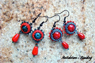Już w trakcie pracy nad pierwszą parą wpadł mi pomysł na zrobienie komuś niespodzianki. Osoba ta lubi koral i lubi kolor zielony. Nie wiem tylko czy spodoba jej się połączenie tychże kolorów. W drugiej parze kulka jest z zielonego afrykańskiego turkusu, do którego dołożyłam czerwoną szklaną kroplę. Połączenie dość ryzykowne, ale uznałam że na wakacjach trochę ekstrawagancji nie zaszkodzi nikomu.