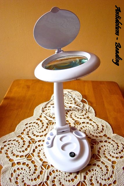 I'd like to show you my last purchase which I love. A lamp with a magnifying glass. What's more, it has two joints which allows much movement and lets you move its arm and head into any position comfortable to you.