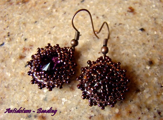 Zdarzyło się tak, że pilnie potrzebowałam czegoś w fiolecie. Rivoli czekały od dawna, bo jako ich wielbicielka mam pokaźny zapas kryształków Swarovskiego w różnych rozmiarach, kolorach i kształtach. Zdecydowałam się na kolczyki z rivoli w najprostszym możliwym oplocie. Ale gdy popatrzyłam na gotową pracę czegoś mi brakowało. Dorobiłam więc gwiazdki od frontu. Potem dorobiłam plecki, żeby tył nie był goły. Oto rezultat. Kolczyki są w 90% fioletowe z wyjątkiem mieniącego się miedzią brzegu, który i tak jest praktycznie niewidoczny, bo zasłaniają go pikotki.