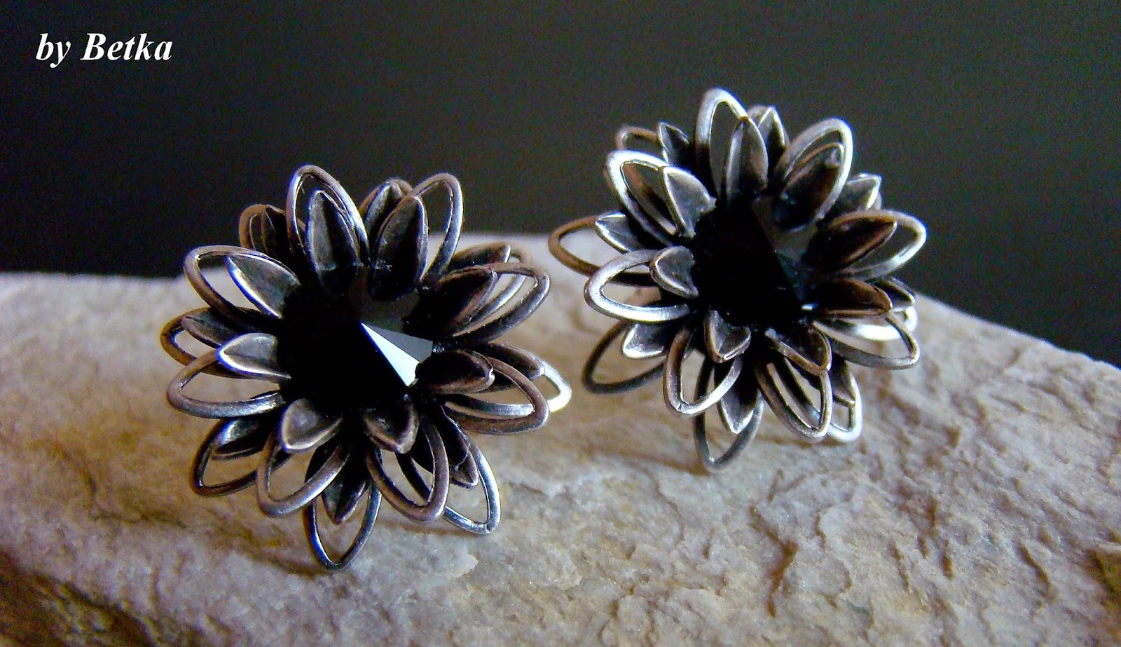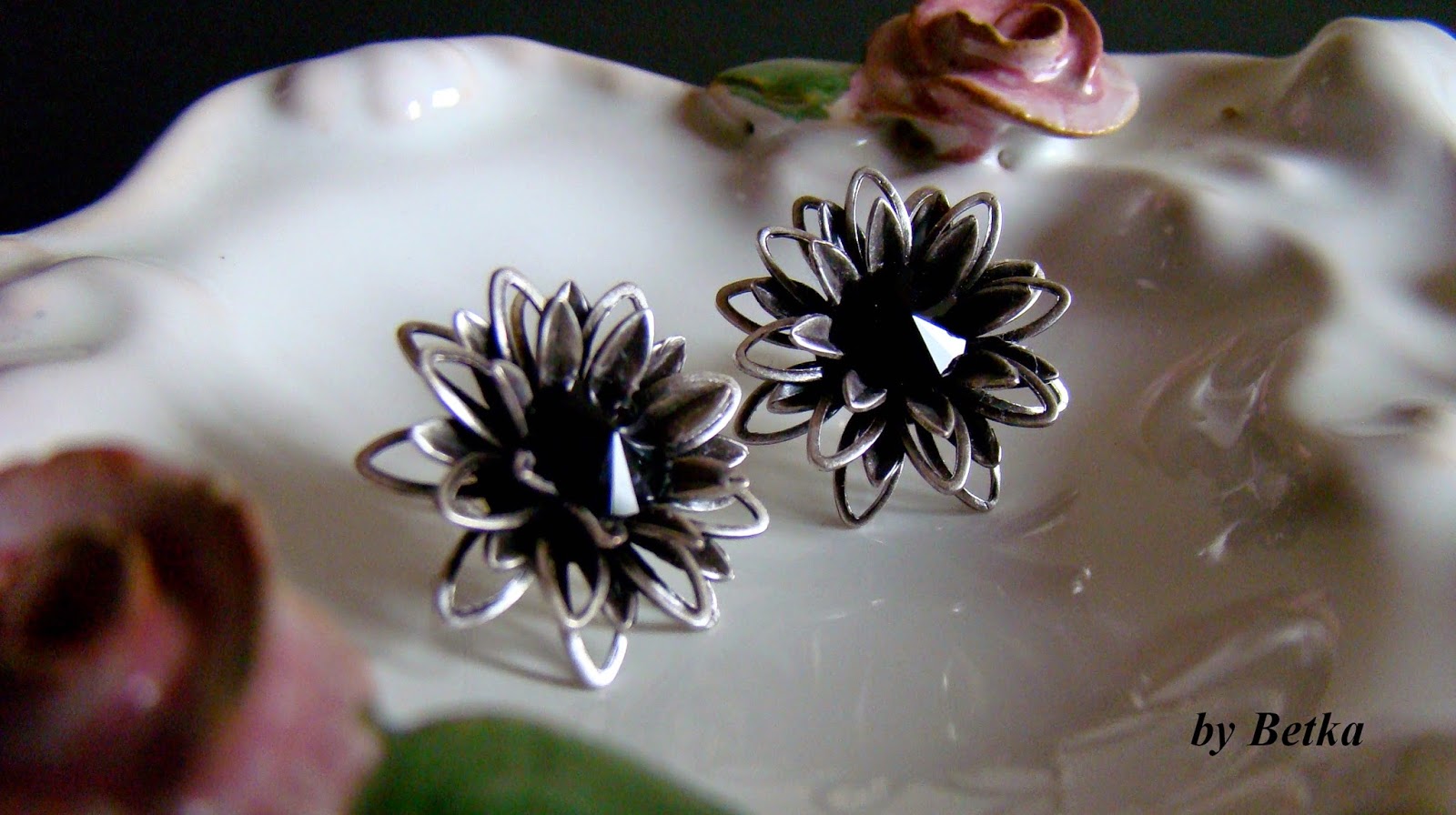 A w 'koralikach' ... zabrakło koralików. Kolczyki powstały z gotowych elementów. Śliczne częściowo ażurowe koszyczki posłużyły za bazę, w którą wkleiłam 8mm rivoli jet. Kolczyki zamocowane są na srebrnych sztyftach. I gotowe.