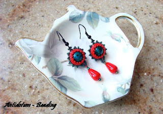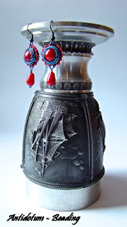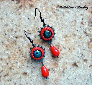 Już w trakcie pracy nad pierwszą parą wpadł mi pomysł na zrobienie komuś niespodzianki. Osoba ta lubi koral i lubi kolor zielony. Nie wiem tylko czy spodoba jej się połączenie tychże kolorów. W drugiej parze kulka jest z zielonego afrykańskiego turkusu, do którego dołożyłam czerwoną szklaną kroplę. Połączenie dość ryzykowne, ale uznałam że na wakacjach trochę ekstrawagancji nie zaszkodzi nikomu.