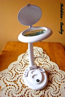 I'd like to show you my last purchase which I love. A lamp with a magnifying glass. What's more, it has two joints which allows much movement and lets you move its arm and head into any position comfortable to you.